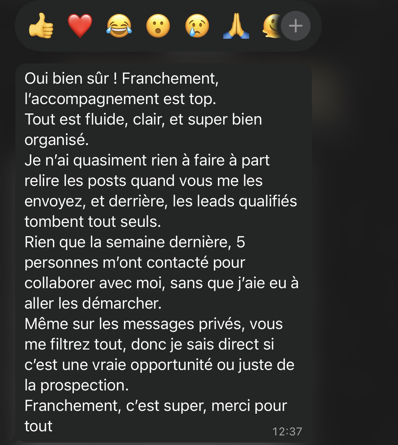 Mon truc, c’est de créer une vraie présence pour les dirigeants : du contenu qui attire, une image pro qui inspire confiance et une stratégie qui fait avancer les choses.